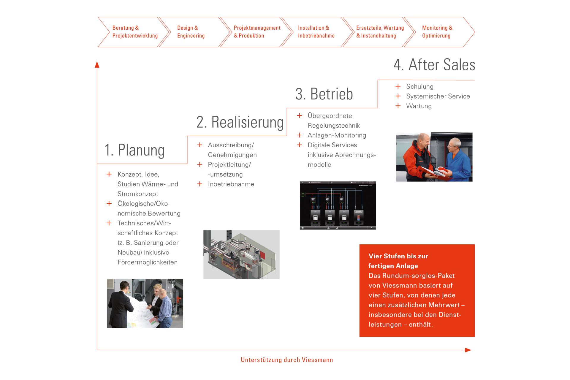 Viessmann's comprehensive, worry-free service package consists of four phases, each of which contains additional benefits, especially in terms of services. The infographic provides a detailed overview of the range of services and project support provided by Viessmann.