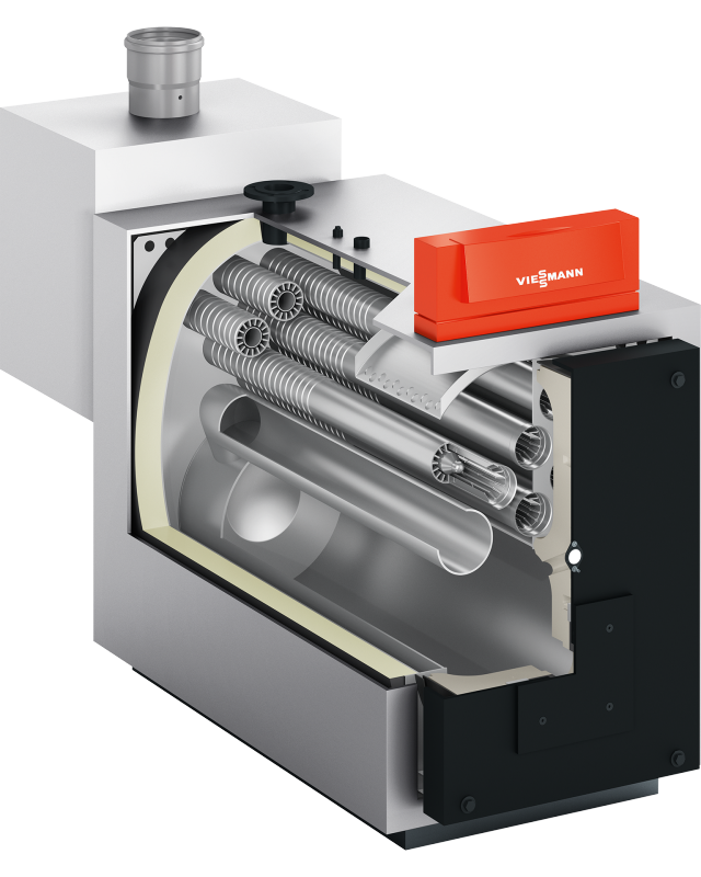 The Vitoradial 300-T is an innovative combination of the Vitoplex 300 low-temperature boiler with an Inox-Radial heat exchanger installed directly on the boiler for the use of condensing technology. Proven multi-layer convective heating surfaces in combination with the corrosion-resistant Inox-Radial heat exchanger provide highly efficient two-stage heat recovery. Vitoradial 300-T is suitable for operation on all commercially available ultra-light (EL) fuel oil and natural gas.